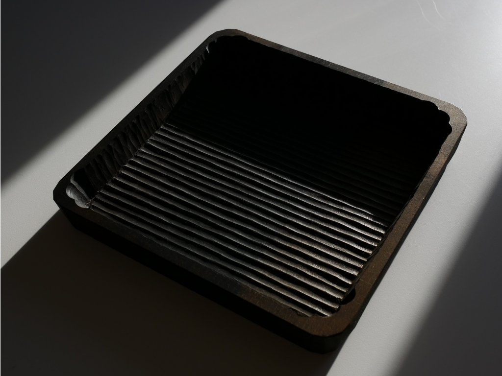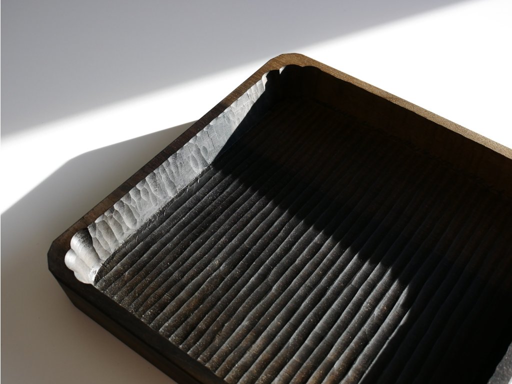 Wooden tray in the style of Japanese Wagatabon trays. Black ebonized finish underlines the carved details and its minimalist form. The tray is hand-carved from european walnut.