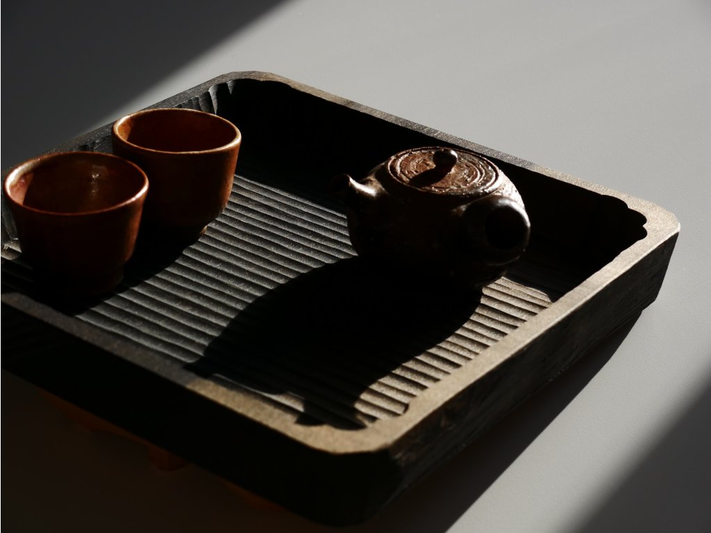 A hand-carved ebonized wooden tray in Wagatabon style with inside and outside linear carving. Ideal tray for your tea sessions or as a display tray for your loved objects.