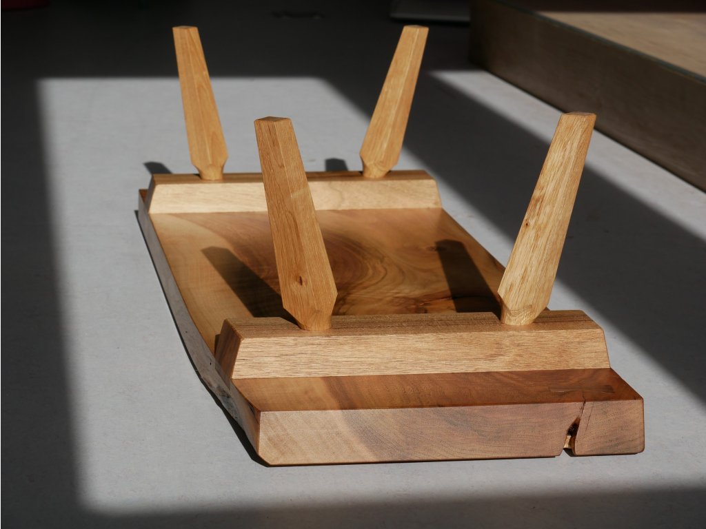 This table has hand-planed finish and hand-cut joinery (sliding dovetail battens). The legs were shaped with axe and then hand-planed to its final form.